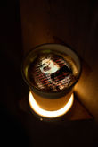 Mirrored take-out container in a tire at the bottom of an empty pool.
