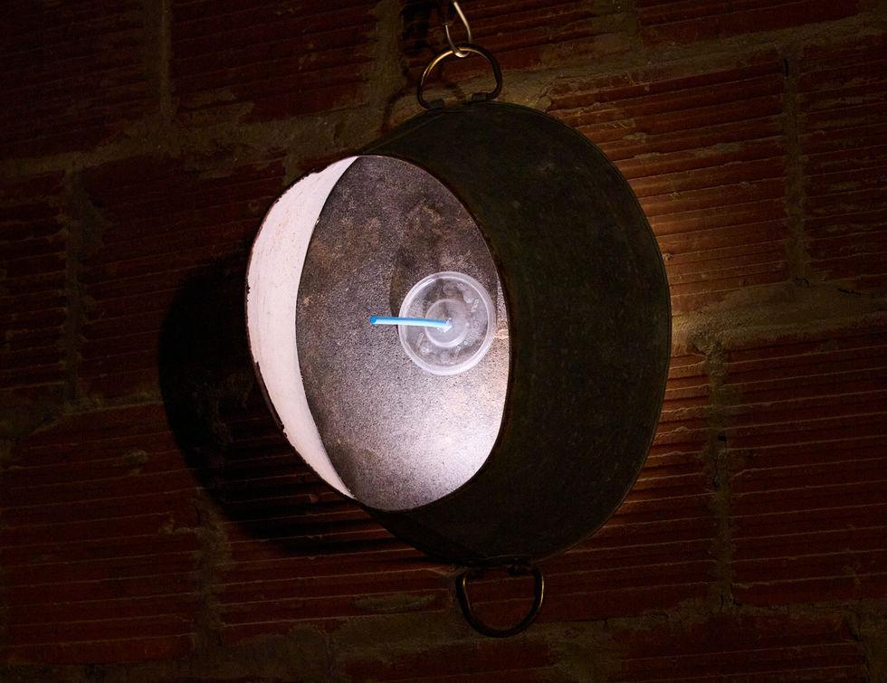 7 sculptures in sand, glass, grass, gasoline, sugar, iron, tropical fruit, paper, light.